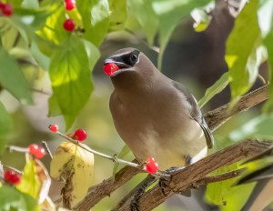 So, besides providing bird seed for seed-eating birds like blue jays, chickadees, titmice, cardinals, sparrows, and doves, you can provide fruit eating birds with berries by planting native berry producing shrubs and trees. Some of the seed eating birds will eat berries as well, and you can also attract birds like mockingbirds, robins and Cedar Waxwings.