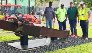 The 11-foot section of I-beam from the World Trade Center was acquired five years ago and donated by the Rubinstein Family, who also donated the land for Evelyn’s Park on Bellaire Boulevard. It’s been in storage except for a period last year, the 20th anniversary, when it was loaned to the Lone Star Flight Museum in Galveston.