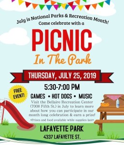 Picnic in the Park will be held from 5:30-7 p.m. at Lafayette Park, 4337 Lafayette St., and will feature food, music and games.