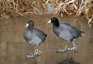 American Coots are often mistaken for ducks, but a quick look at their pointy wedge-like beaks and flanged toes (as opposed to webbed toes) show you that they’re different birds. They are actually more closely related to rails and cranes. We have Coots in the area year-round, but their numbers greatly increase here this time of year, as birds from the North migrate down to overwinter. These noisy water birds can be found at many parks in the area with ponds and lakes and are very common, often being the only waterbird around.