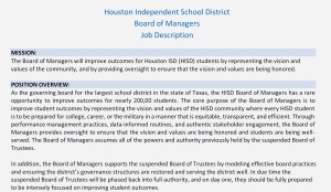 In an interview with KHOU-Channel 11 anchor Len Cannon, Morath outlined the process: “…they will assume all the powers and duties of the elected school board, so it’s essentially a shift in local control from the current locally elected board to an appointed board of nine. They then have all of the duties and obligations to govern the school system like any governing body in the State of Texas, so they’ll oversee the superintendent. They’ll set strategic direction. They’ll set budget. Their job as a team is to be focused like a laser on the needs of students above all else.”