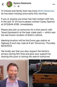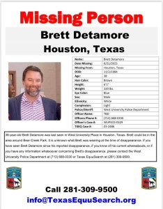 Friends have largely used social media, including West U-specific platforms and a Facebook group, “Find Brett Detamore,” to ask for help in locating him since his wife, Ryann, first reported him missing Wednesday, and to coordinate an unsuccessful ground search of the park with EquuSearch. Bear Creek-Pioneers is a county regional park north of the Katy Freeway in the Memorial area.