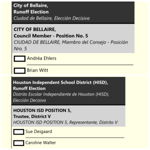 Andréa Ehlers and Brian Witt are facing off for Bellaire Council Position 5, and incumbent Sue Deigaard of southwest Houston and Caroline Walter of West University are seeking the HISD District V seat — one of four HISD places on the nine-member board that will be decided Saturday. With control of each elective body at stake, both of the supposedly nonpartisan races have been unusually fierce and characterized by dueling endorsements and political party involvement.