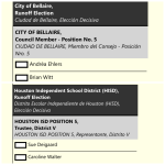 Polls will be open from 7 a.m.-7 p.m. Saturday (Dec. 11) — including at Bellaire and West University city halls — to decide who will fill the last of seven seats at the Bellaire City Council table and who will represent local communities on the Houston ISD school board. Andréa Ehlers and Brian Witt are facing off for Bellaire Council Position 5, and incumbent Sue Deigaard of … [Read more...] about Saturday runoff will determine future of Bellaire council, HISD board