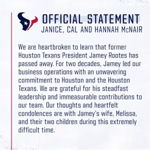 Texans owner Janice McNair praised Rootes’ “unwavering commitment to Houston and the Houston Texans” and his “steadfast leadership and immeasurable contributions” to the team.