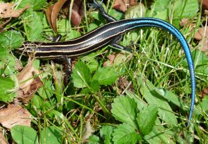 Lizards also have a third eye on the top of the head that looks like a small dot. Its actually a small translucent area of skin that allows light to hit the pineal gland of the brain. This acts as a primitive photo-receptor. The lizard in the photo is a juvenile Five-lined Skink which will change its appearance (depending on the sex) as it grows older.
