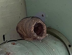Wasps living in small nesting groups, like our red paper wasps Polistes carolina, and in large hives, like yellow jackets and hornets, make paper nests. It’s believed that humans got the idea for making paper by observing paper-making wasps. Paper wasps make hives like honeybees, but instead of using wax exuded from their bodies, they scrape small bits of wood from trees (or posts and picnic tables), mix it with saliva, and sculpt it into cells the size of their antennae. Yellow jackets and hornets are papier mâché professionals. They build hundreds of cells, then surround them all with a paper wrapper, much like a piñata. Just don’t whack them!