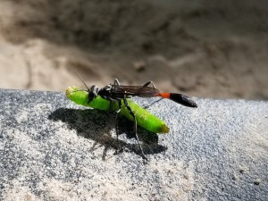Many species of wasps stock their nests with either caterpillars or spiders. You can occasionally see them struggling with caterpillars that are as long as their own bodies, or big hairy spiders that are twice as big around, ferrying them to their nests in the ground. Down in the nest chamber they lay an egg on the stunned but still living prey. Imagine what would happen without wasps to keep those caterpillar and spider populations in check.